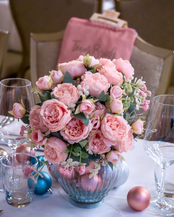 The guests each got a little "Bridal" Bag with various beauty and bookish goodies and a bath bomb throned each plate. Once everyone was seated at the beautifully decorated tables, the author spoke not only warm welcoming words but also about the emotional story of her late best friend and author Daniella Hartig, whose work would now be rereleased in the new romance and fantasy publishing house PureBelle. Hartwarmingly the family of Hartig was in attendance to celebrate her life and accomplishments with everyone. The Dinner was served between each program point. After the first appetizer, Hartig's first chapter of Kiss the Right Bride was read with the beautiful voice of audiobook narrator Marlene Rauch. After listening to the book we were intrigued by the storyline of the wedding planer and wanted to hear more - something which was certainly fulfilled after the maincourse. In between those meals, fans gathered to get their books signed and pictures taken with Wonda and we took the opportunity to meet those in attendance.