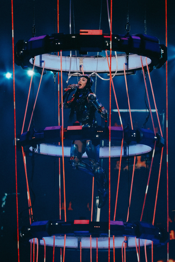 A flickering VCR-inspired intro, driven by futuristic visuals, set the evening’s atmosphere, somewhere between cyberpunk and retro arcade. Katy Perry emerged, both robotic and magnetic, opening with “Chained to the Rhythm”. While the backing track carried part of the load, Katy Perry delivered her signature powerhouse vocals when it mattered.
