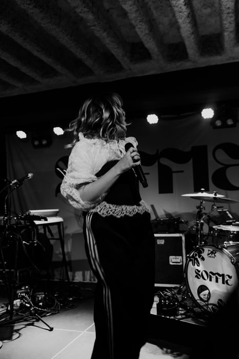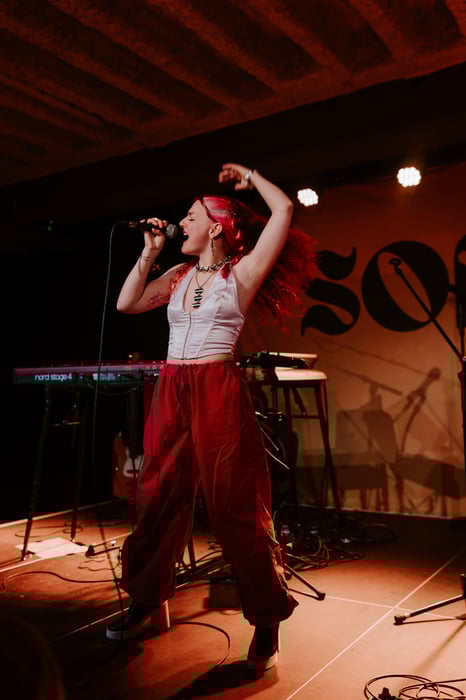 In between, SOFFIE talked about how she processes her stormy feelings and dark phases through music. This was seen in the next song "Poltergeist" as it had moving lyrics and the overall setting in the room seemed intimate and full of emotions. It was another exclusive sneak peek in her new EP, therefore her fans seemed in awe by the new and promising music. The EP is titled after song "Unterwegs" which followed and was all about her new beginning as she is on the way to hopeful and bright future.