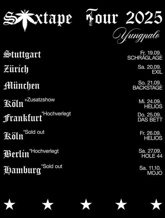 Since his debut in 2020 with the single "TOKYO DRIFT", Yungpalo has continued to deliver versatile projects while consistently pushing boundaries and enriching German rap with a disruptive, rough sound. His latest album, "S*xtape", captures this energy and now serves as the centerpiece of his tour through Switzerland and Germany.